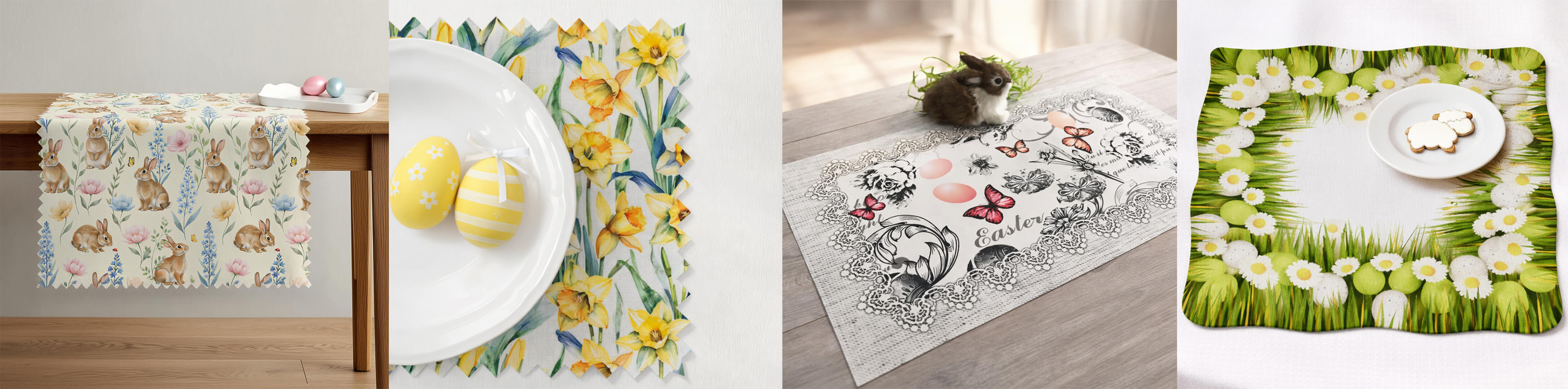 - Motywy wielkanocne (kwiaty, zajączki, pisanki) subtelnie podkreślają świąteczny klimat
