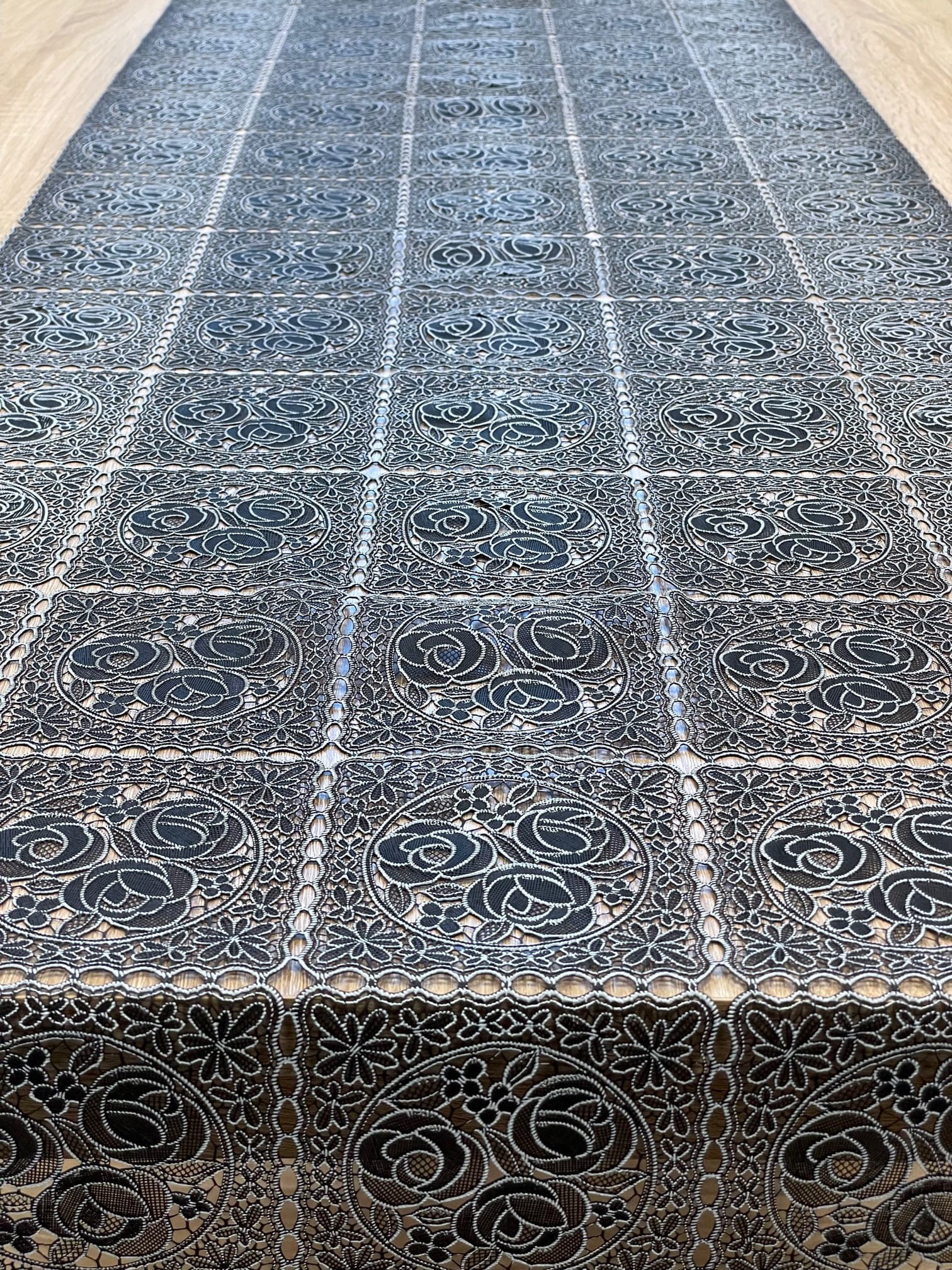 Bieżnik winylowy z koronki Dia Lace charakteryzuje się doskonałą jakością i nienaganną estetyką, doskonale imituje strukturę tkanin naturalnych.