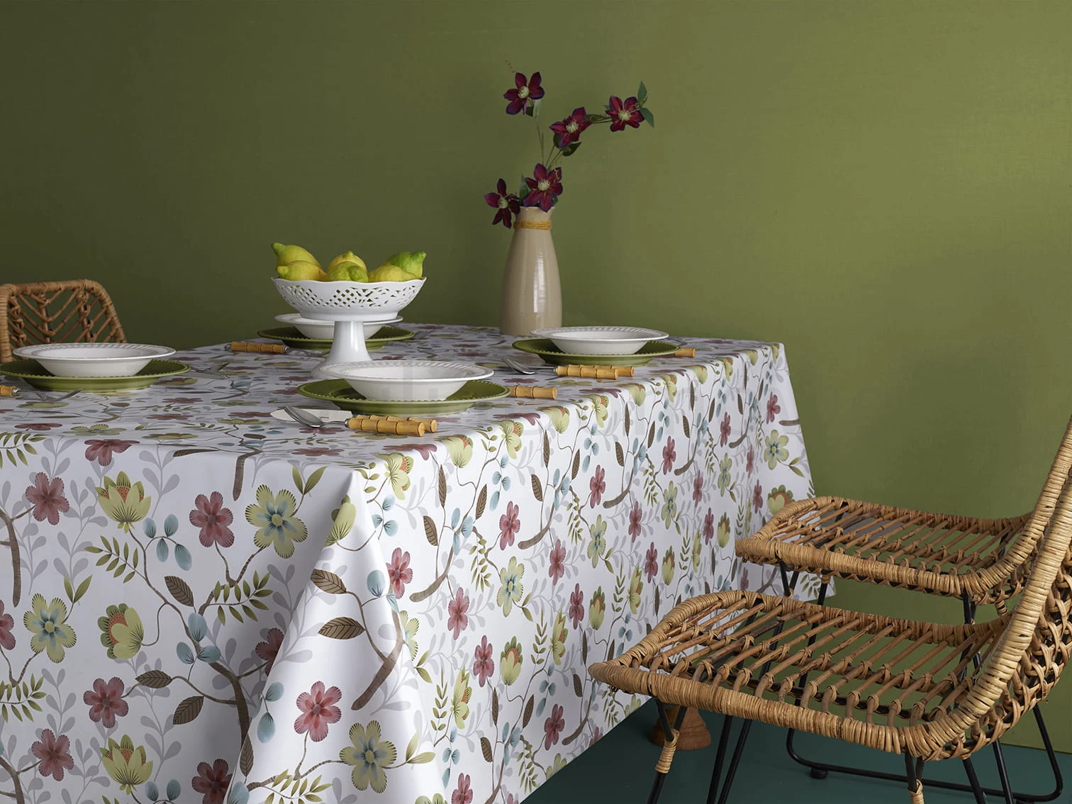 Nasz obrus łączy praktyczność z unikalnym stylem dzięki pięknemu, botanicznemu wzorowi.