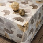 Odkryj dekoracyjny obrus z ceraty w artystyczny wzór geometrycznych kół w odcieniach beżu, brązu i szarości.