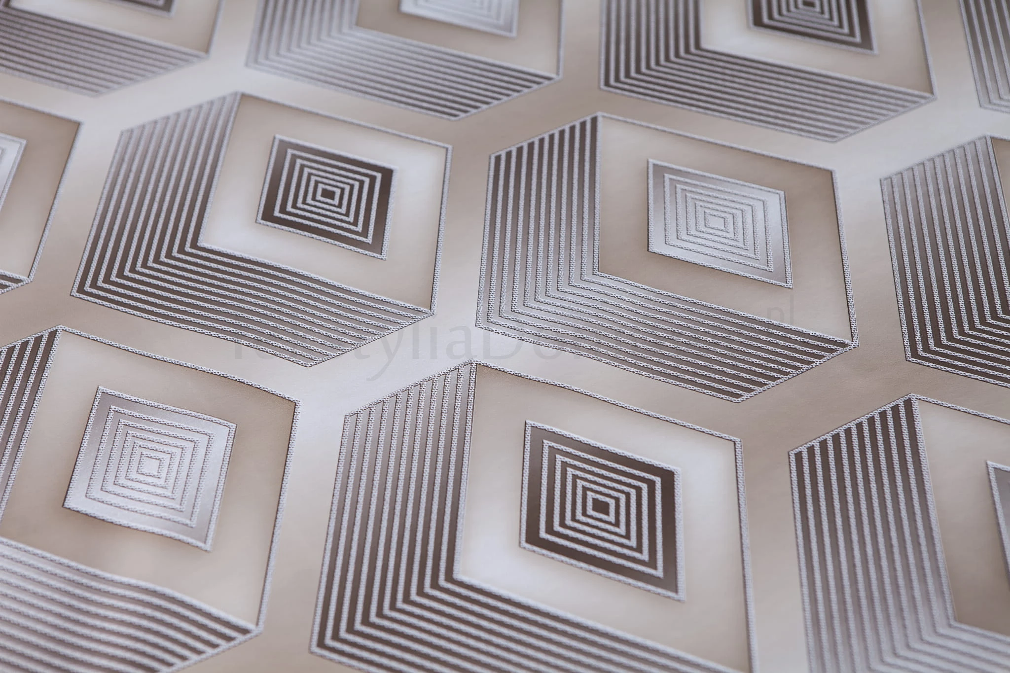 Ten wyjątkowy produkt łączy w sobie praktyczność i szyk, oferując wzór geometrycznych, trójwymiarowych kwadratów w subtelnych odcieniach beżu i szarości.