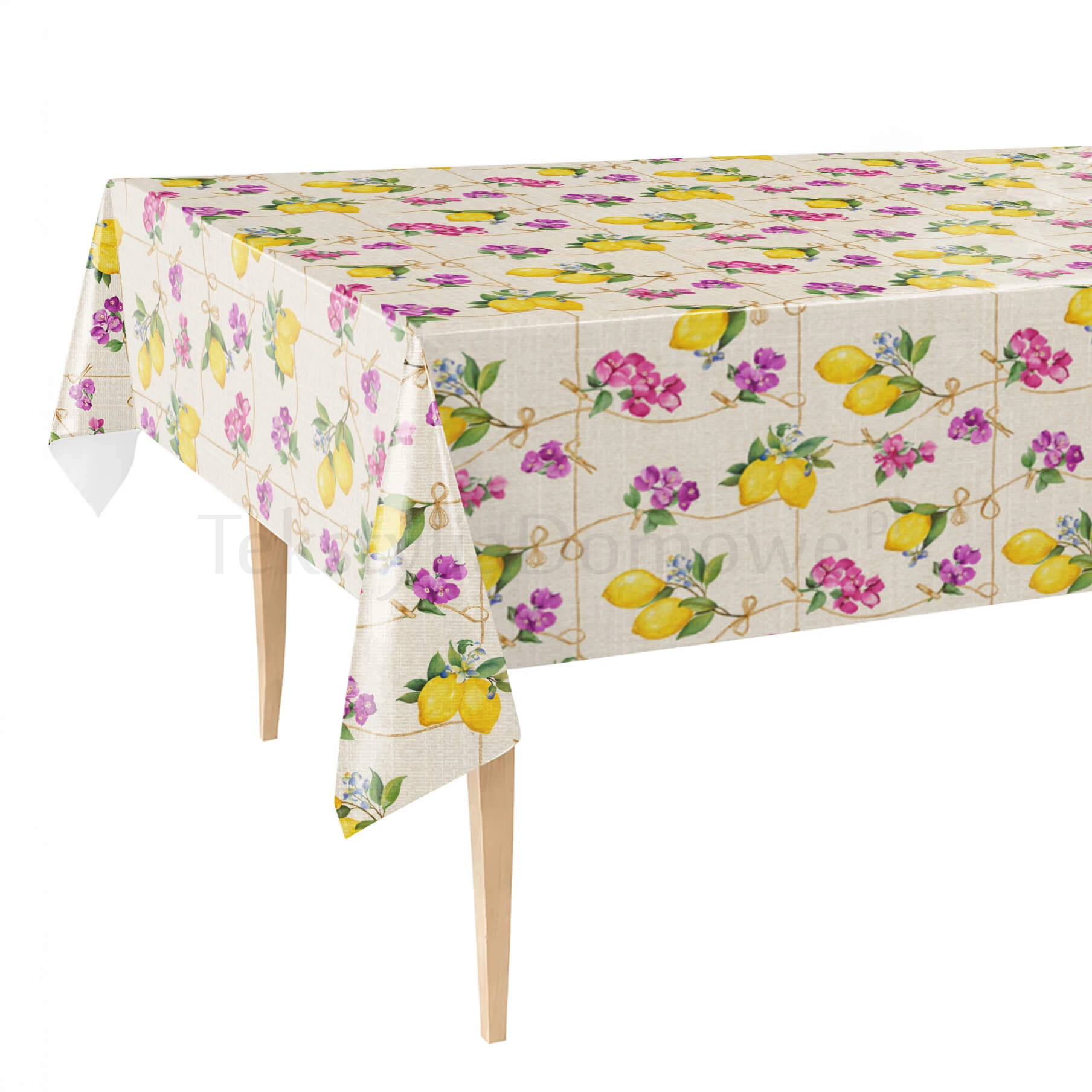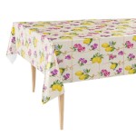 Ten uroczy obrus zachwyca eleganckim wzorem pełnym kolorowych akcentów - soczystych cytryn i subtelnych, fioletowych kwiatów, które przyciągają wzrok i dodają wnętrzu świeżości oraz naturalnego uroku.