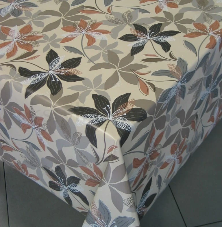 Urokliwy wzór stylizowanych kwiatów w modnych kolorach beżu, brązu i błękitu doskonale komponuje się z każdym stylem. Wysoka jakość PVC gwarantuje trwałość i łatwe czyszczenie.