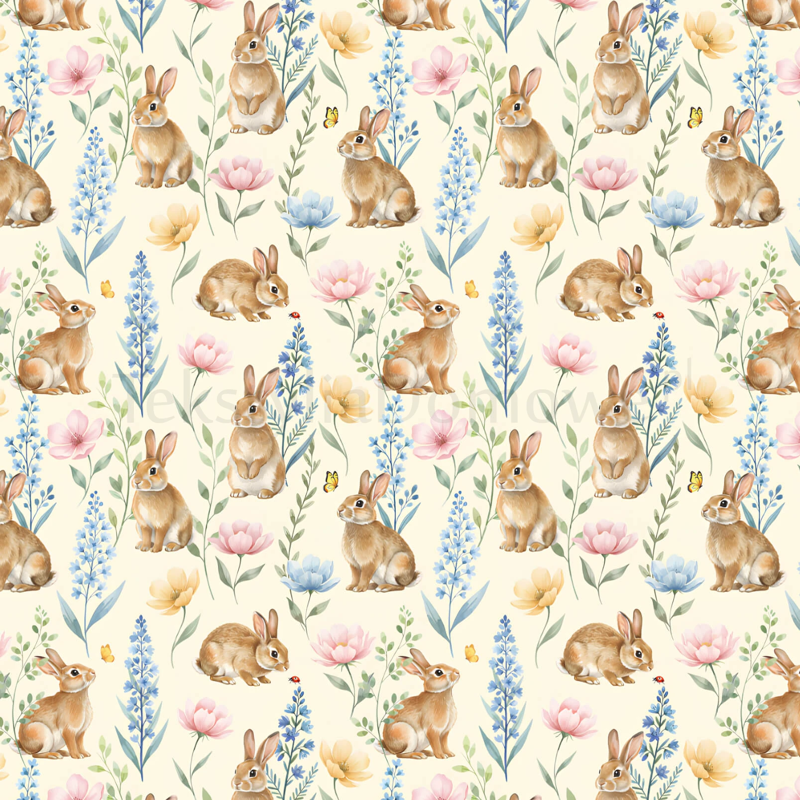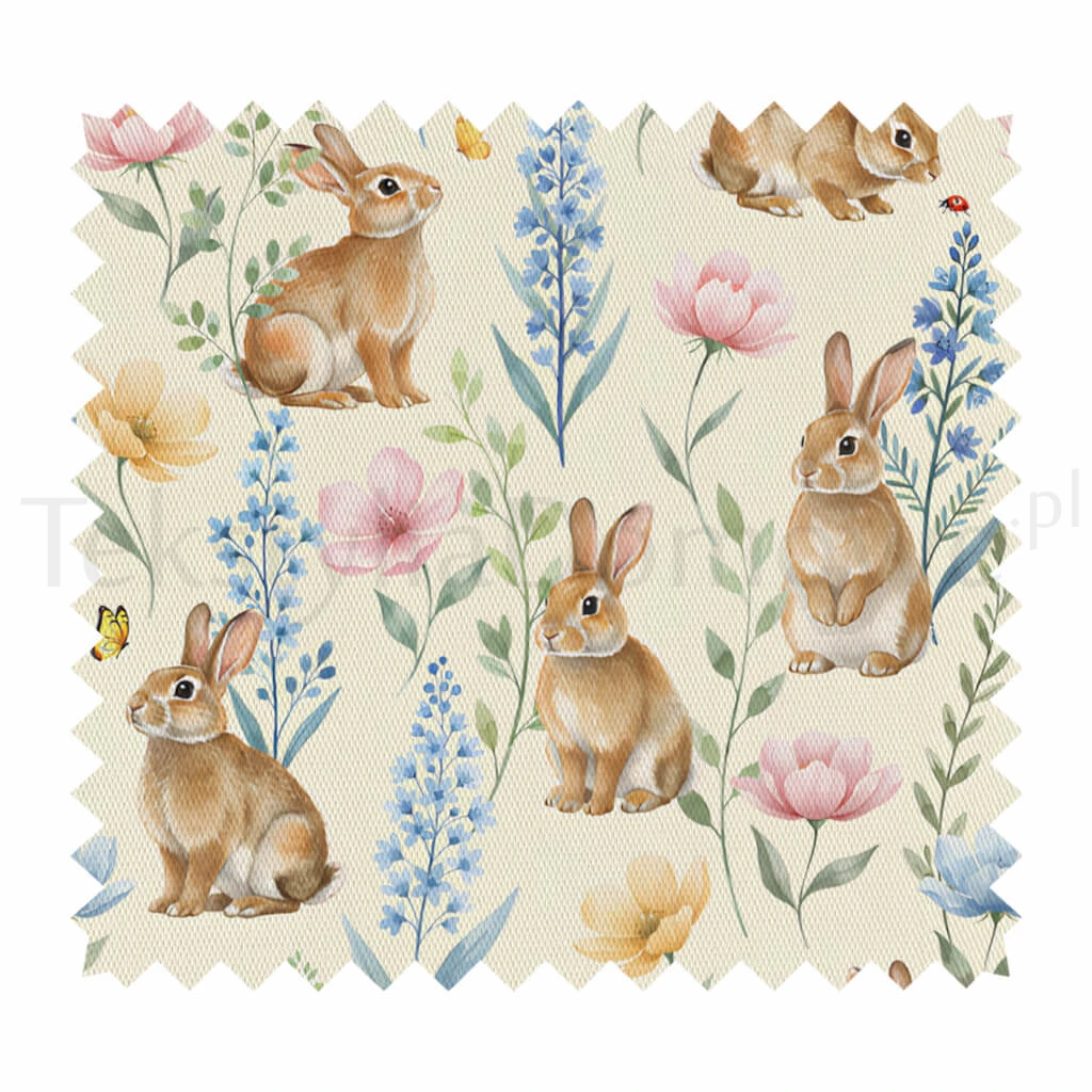 Wzór w delikatne, realistycznie malowane zajączki w naturalnych odcieniach brązu otulone są subtelną kompozycją pastelowych kwiatów. Wzór łączy: